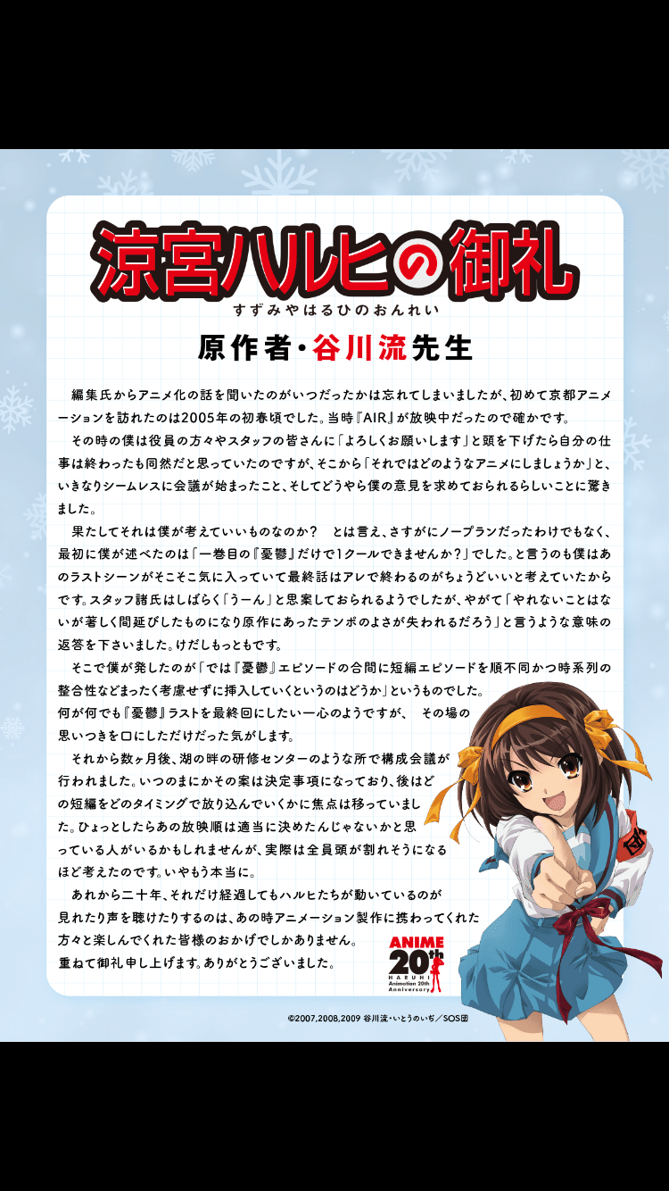 更新TOKYO MXにて、テレビアニメ『涼宮ハルヒの憂鬱』の再放送が2026年3月30日より毎週月曜日22時30分から開始される。
