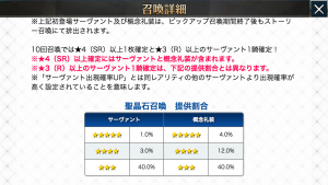 FGOの場合は、サイト内でガチャの各レアリティ別に出現率を定時しています。