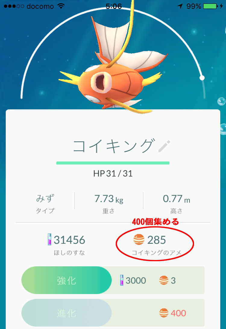 「コイキングのアメ」を400個集めて、コイキングを進化させるとギャラドスになるのである! ポッポはたった12個のアメで進化できるのに、コイキングだけ400個もアメが必要なのはおかしい! そう思っていたあなた! その理由は「ギャラドスに進化できるから」だったのだ。