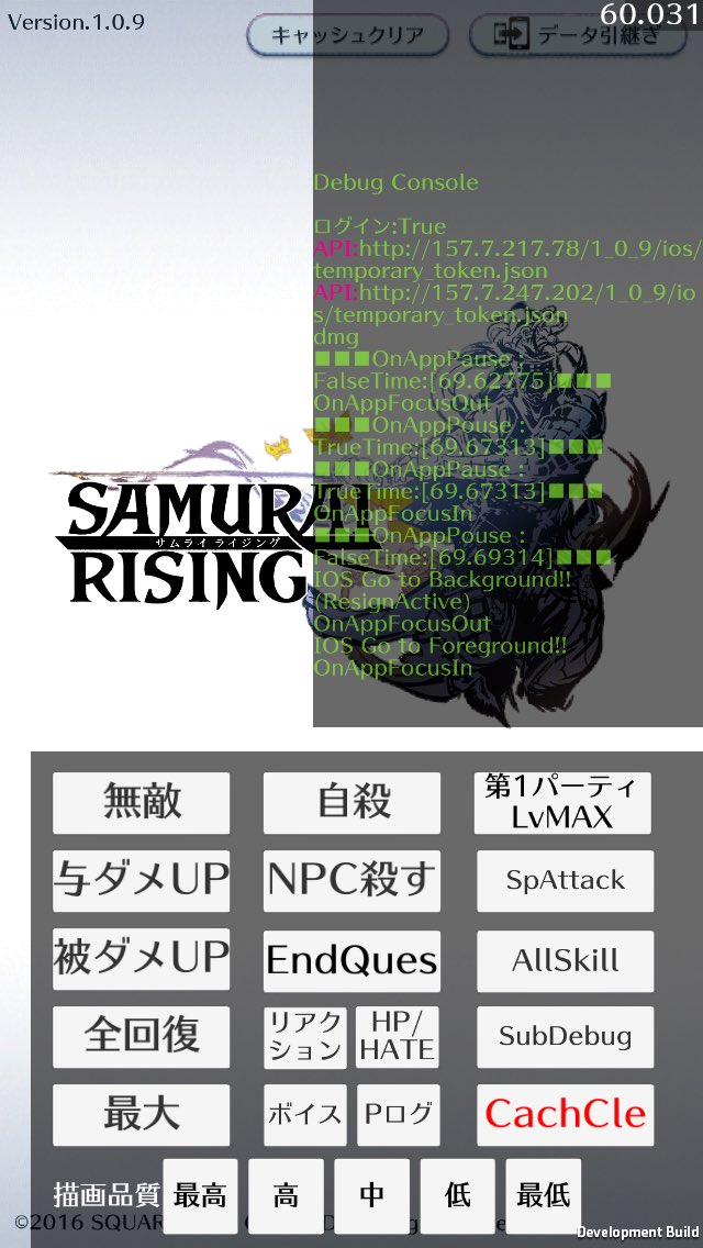 この『サムライライジング』のデバッグモードは「全回復」や「NPC殺す」「自殺」「無敵」などのメニューがあり、
