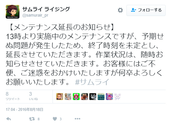 17時終了予定のメンテナンスだが22時頃には続報を知らせるとのことだ。