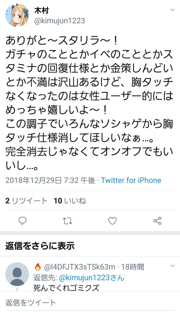 タッチ機能復活するまで全員課金しないボイコットでもすればいいじゃん、その時運営の本心が見える、目には目を歯には歯だ、こいつに何か言ったところで何も変わらない、男は結局口先だけで何もしない、だから女性が今は大きな地位を獲得しつつあるんだよ、文句言ってる暇があるなら動けや