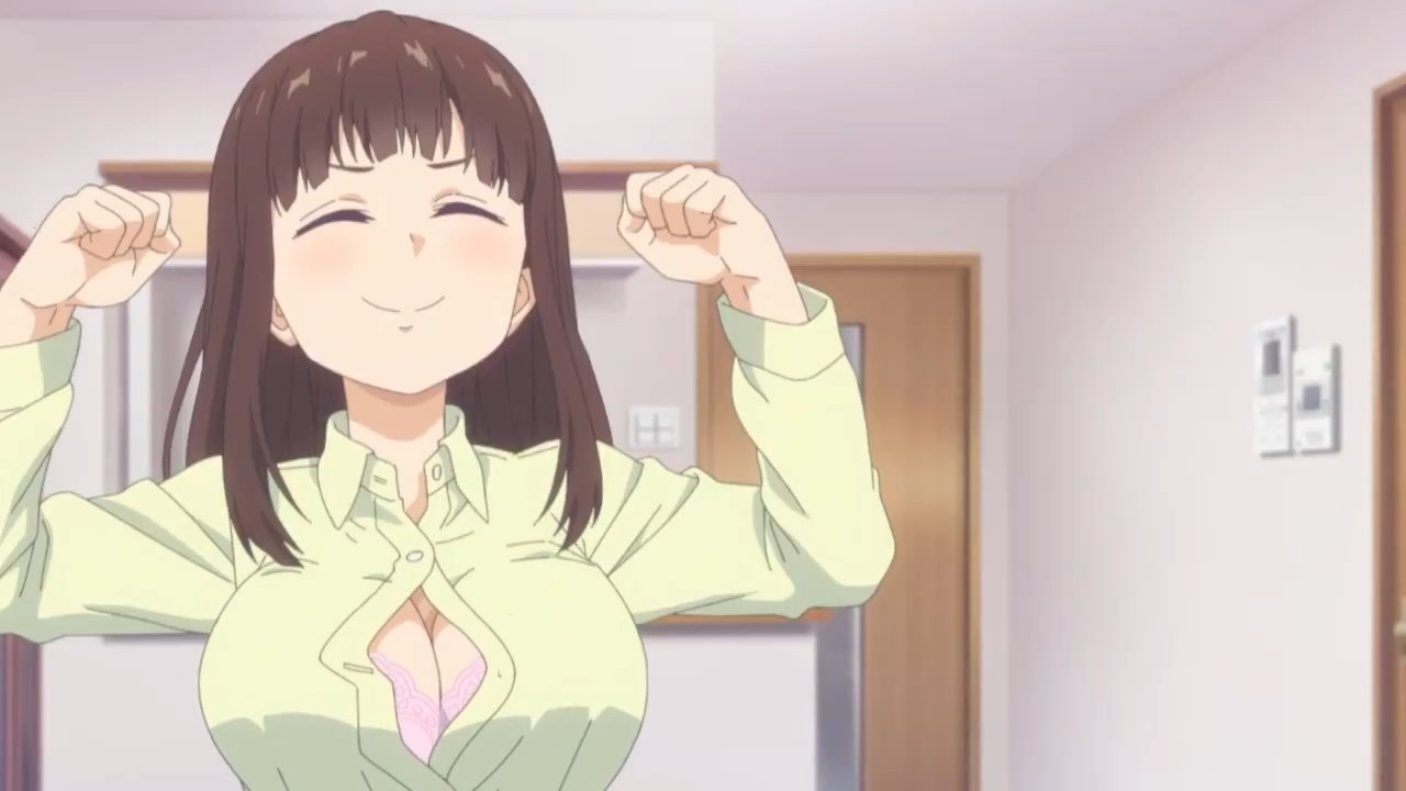 ブラウスの胸のボタンを巨乳の乳圧で吹っ飛ばす女