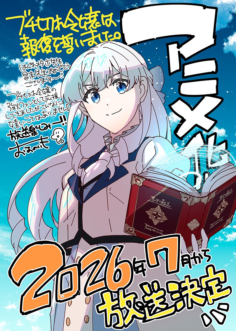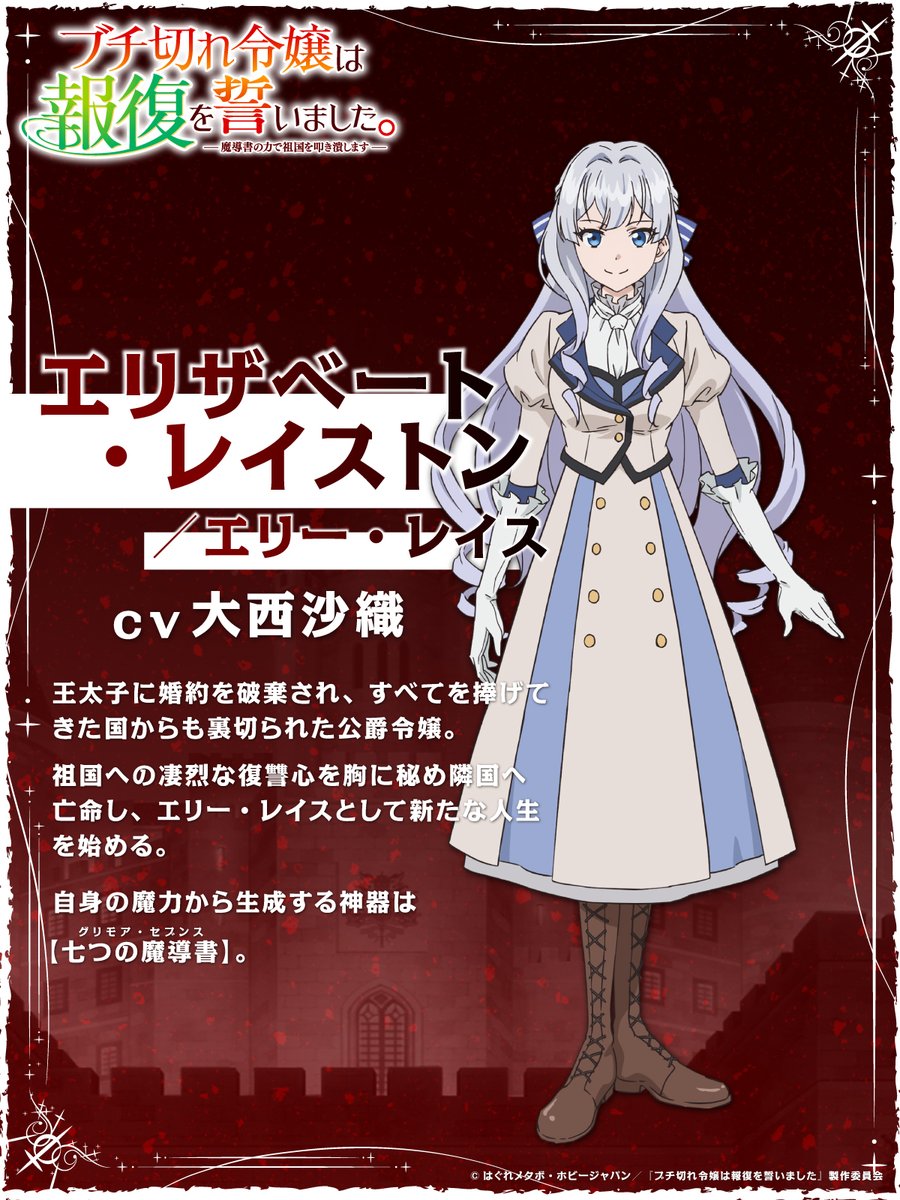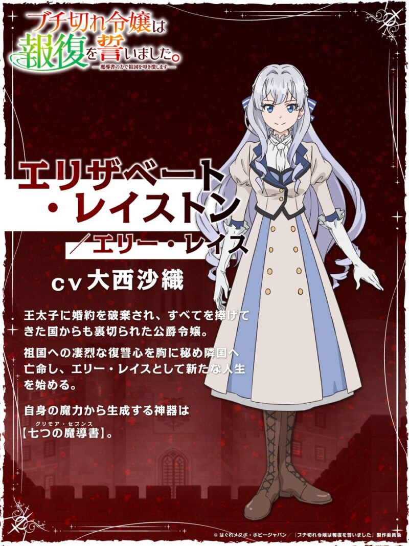「HJ小説大賞2021前期」を受賞したHJノベルス(ホビージャパン)のライトノベル「ブチ切れ令嬢は報復を誓いました。 ~魔導書の力で祖国を叩き潰します~」がテレビアニメ化され、2026年7月から放送されることが分かった。王太子に突然婚約破棄された上に投獄された美しき天才令嬢が、最強の魔導書を手に人脈、経済、武力を操って裏切者たちに報復する“復讐ファンタジー”で、コミカライズもされている人気作。声優の大西沙織さんが主人公エリザベート・レイストン/エリー・レイスを演じることも発表された。